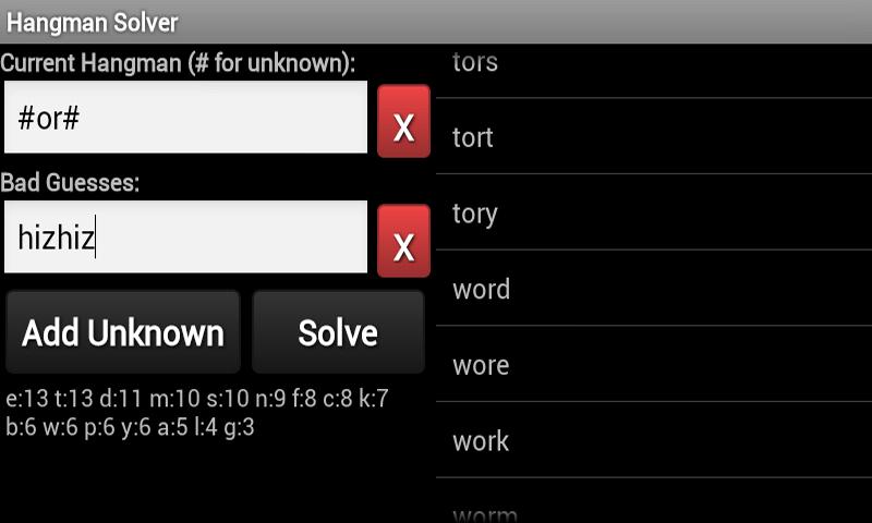 Simple Online Hangman Solver | Game Hangman VerkkoResults: hangman, hangmen; However if we were to add 'e' to the Exluded Letters field it would just return 'hangman' and not 'hangmen'. This is a very simple tool for completing your hangman game that we hope you will enjoy and put to good use. The hangman solver can also work for crossword puzzles and other word games.